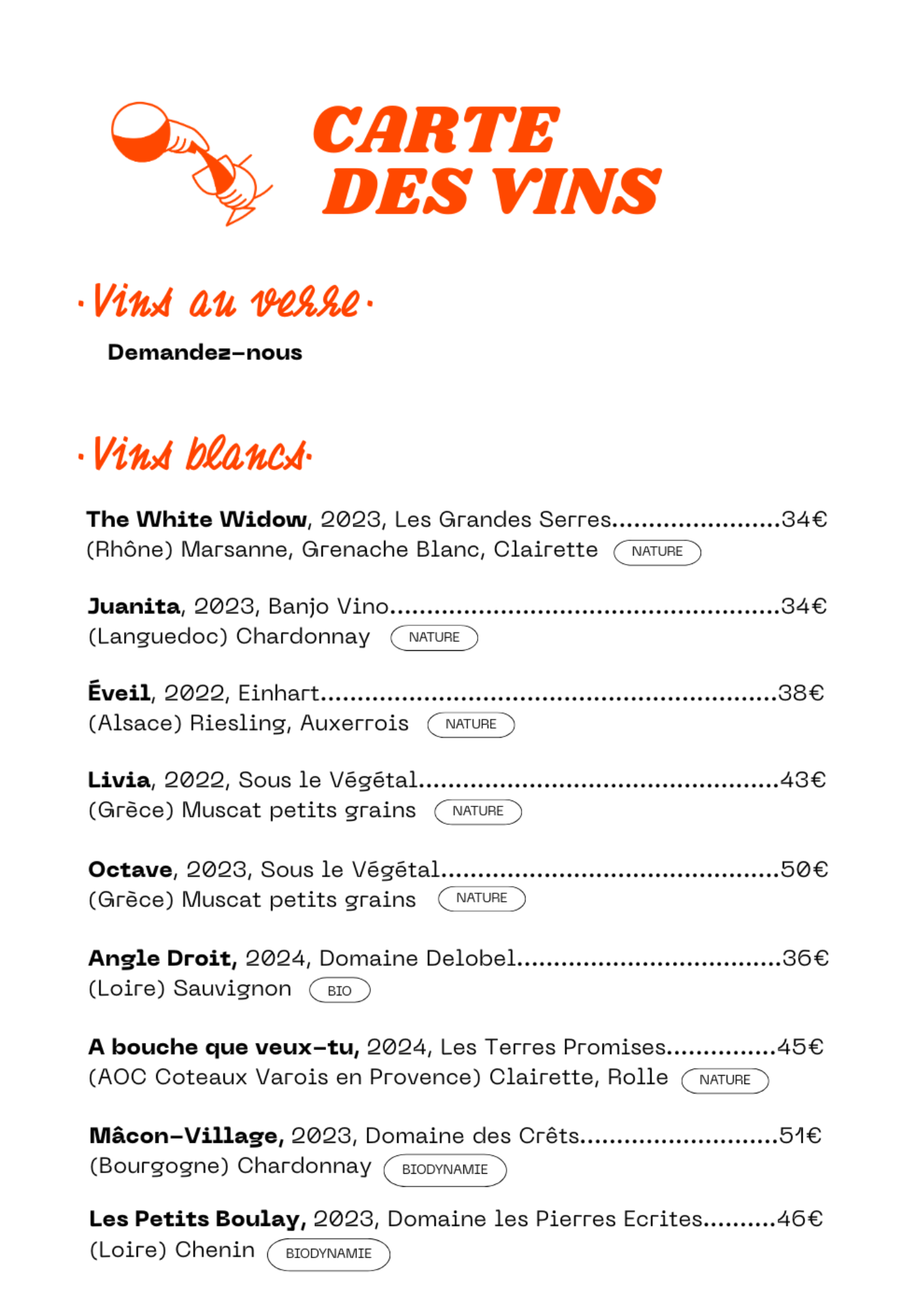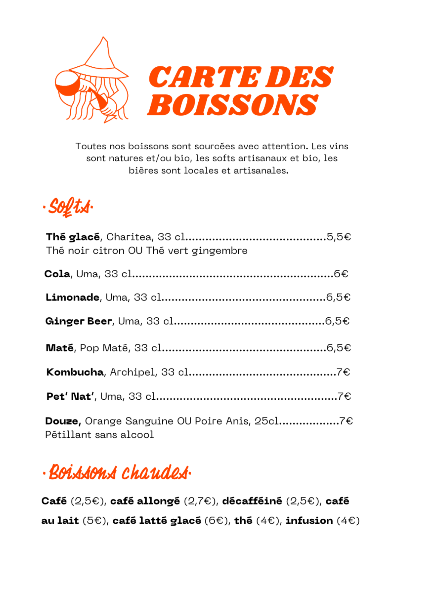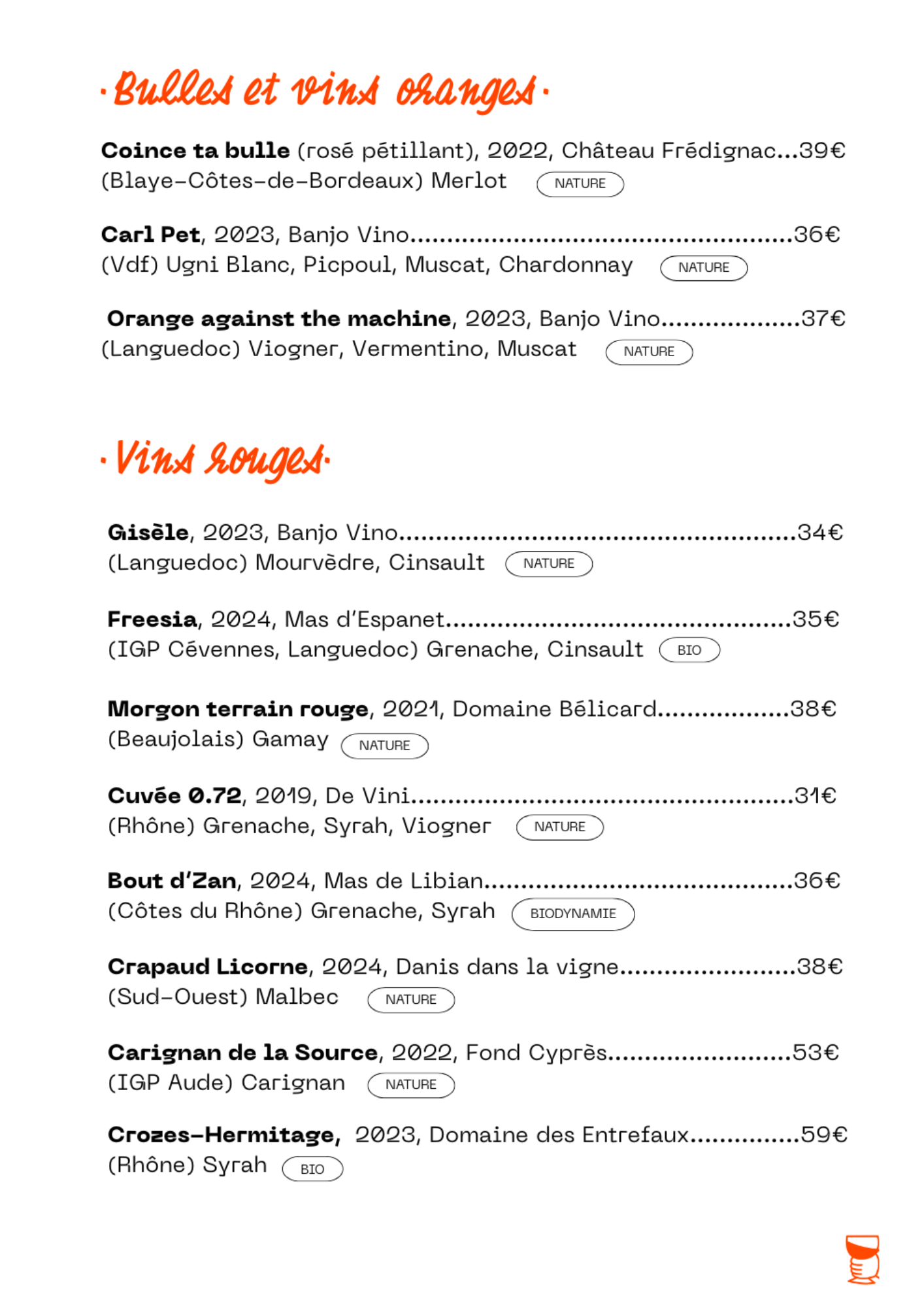 Notre carte évolue au rythme des saisons pour offrir une expérience authentique, sincère et toujours renouvelée. En complément de nos entrées, plats et desserts faits maison, nous mettons à l’honneur une sélection de vins vivants et naturels, ainsi que des cocktails artisanaux élaborés dans un esprit bistrot moderne.