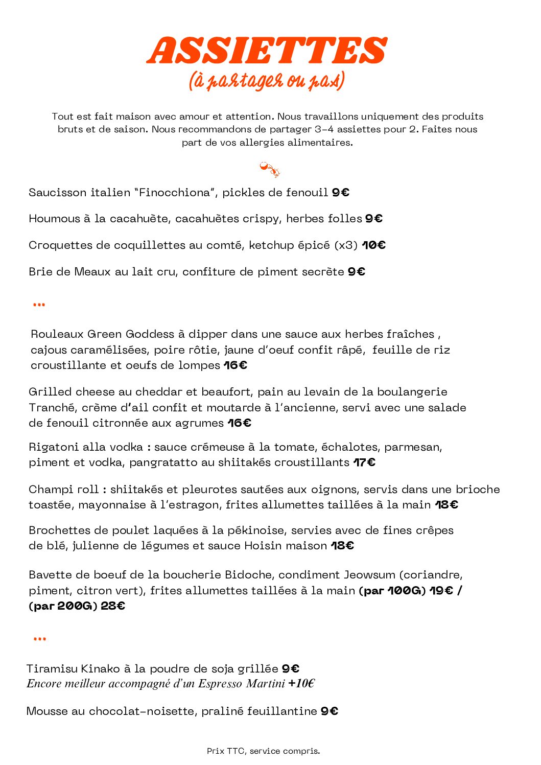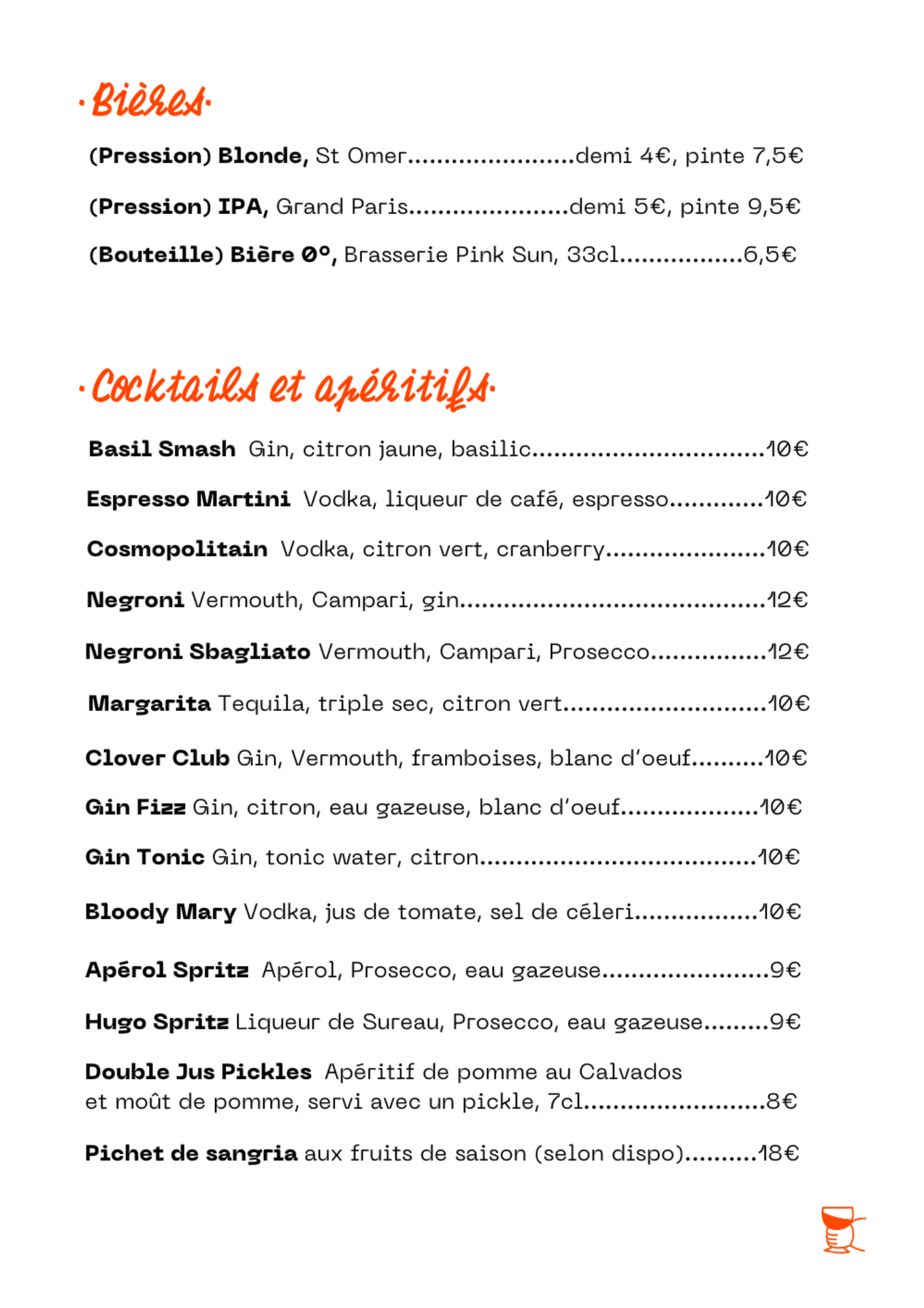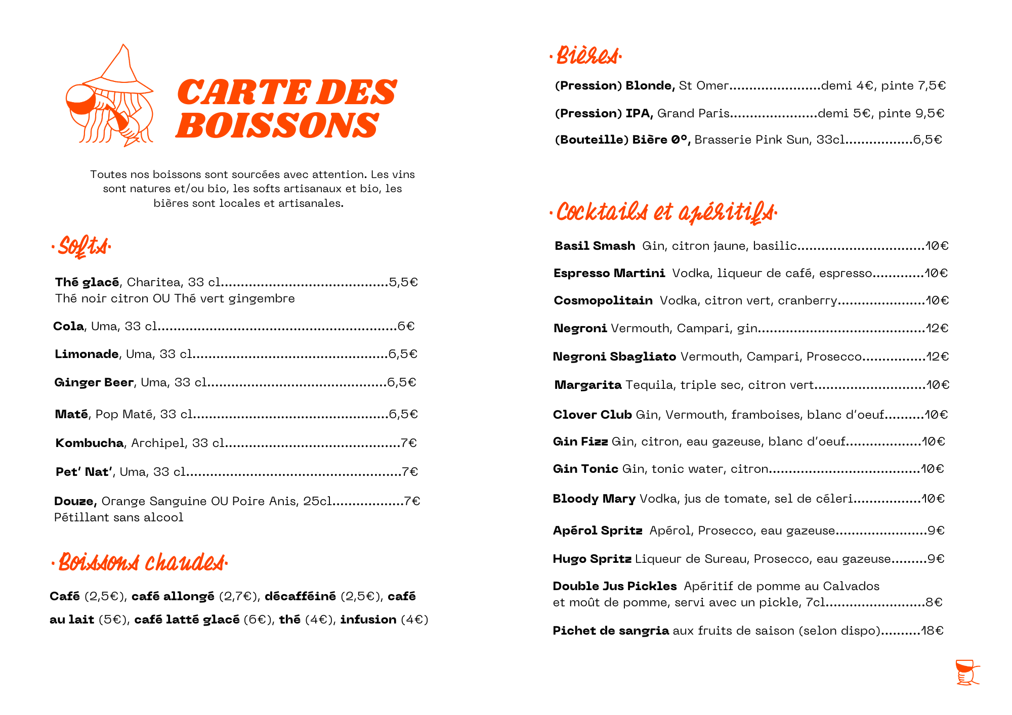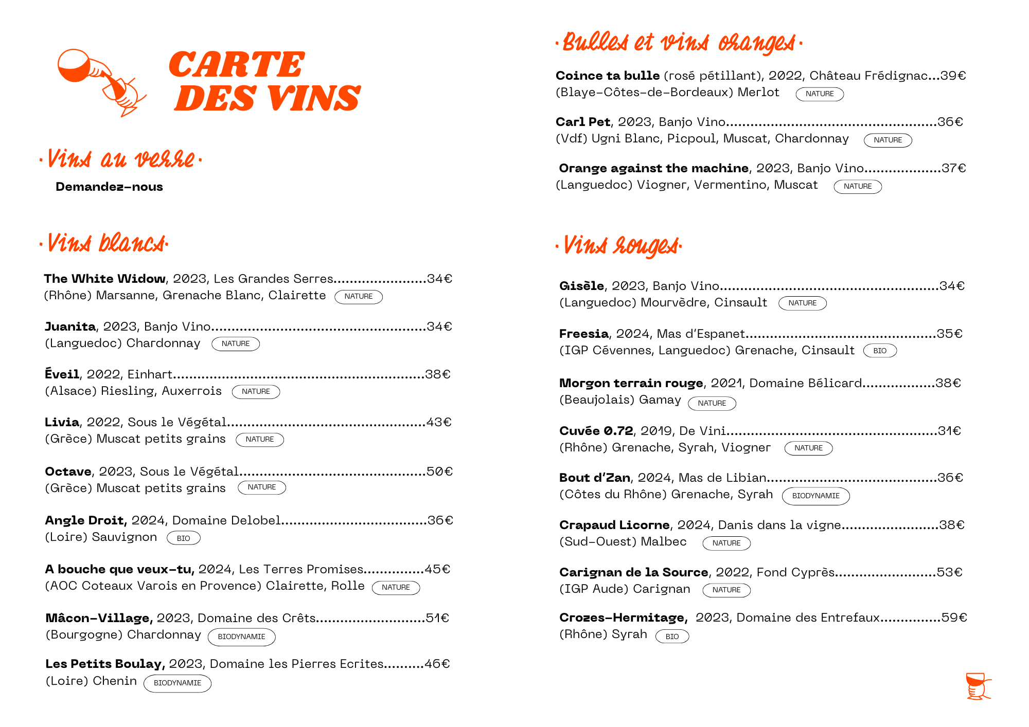 Notre carte évolue au rythme des saisons pour offrir une expérience authentique, sincère et toujours renouvelée. En complément de nos entrées, plats et desserts faits maison, nous mettons à l’honneur une sélection de vins vivants et naturels, ainsi que des cocktails artisanaux élaborés dans un esprit bistrot moderne.
